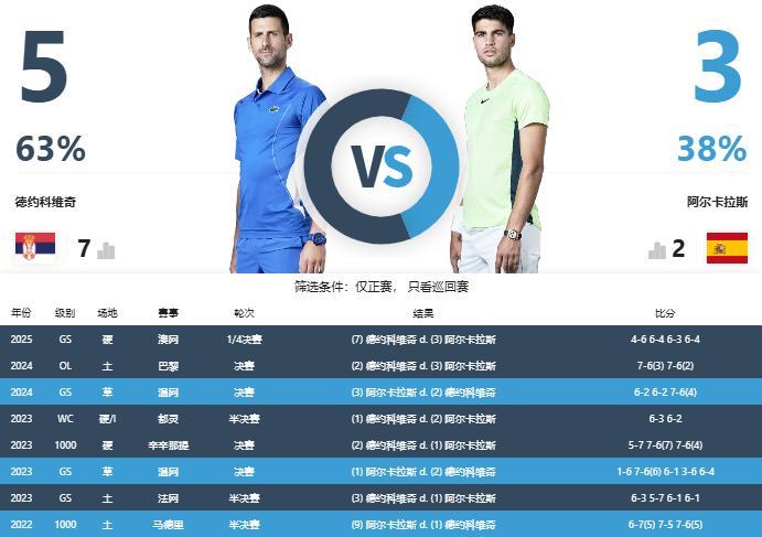 在历史交锋方面,德约5胜3负稍占上风,大满贯交手两人各获得两次胜利,硬地赛德约对阿尔卡拉斯3战全胜。